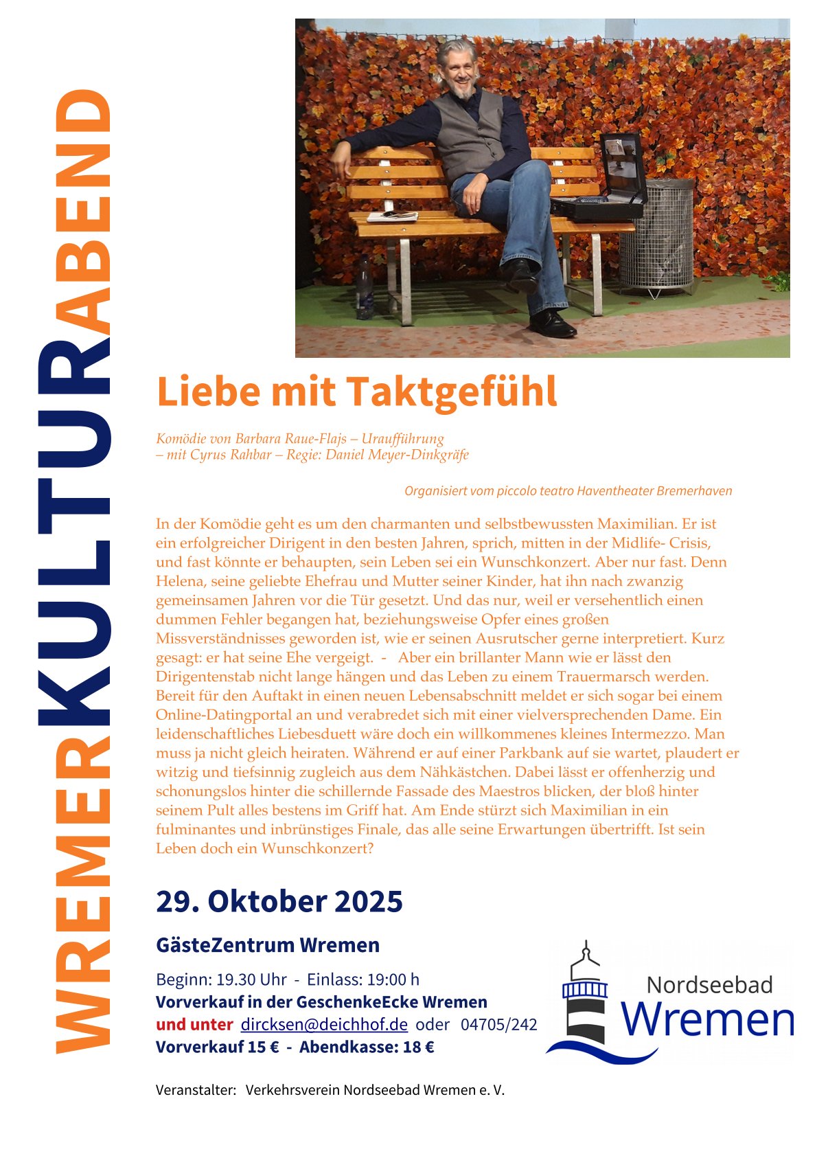 Am Mittwoch, den 29. Oktober 2025 um 19:30 Uhr findet ein Gastspiel von „Liebe mit Taktgefühl“ im Gästezentrum Wremen, Rolf-Dircksen-Weg 33, 27639 Wurster Nordseeküste des Veranstalters Nordseebad Wremen e.V. statt.